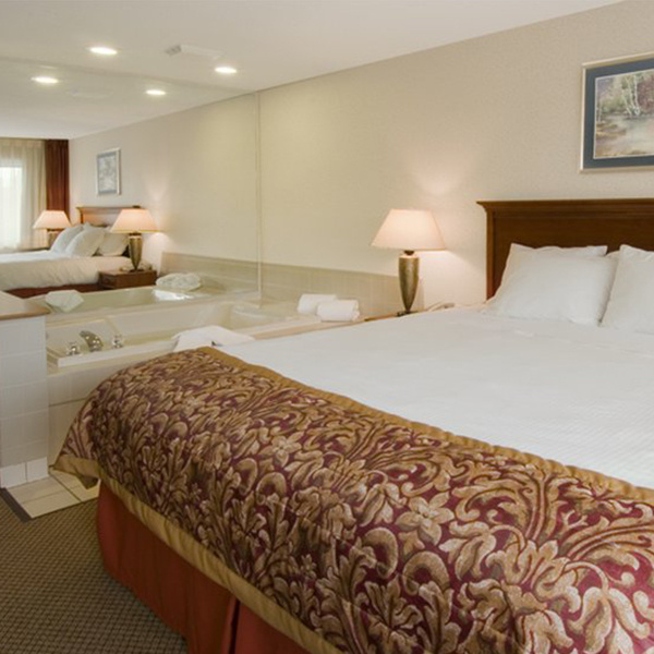 Upgrade to the deluxe Spa Room for an indulgent lodging experience. Pamper yourself in the luxurious full size Jacuzzi tub for two and melt your daily stresses away. Then, cozy up in the pillow top king size bed and enjoy a peaceful night’s sleep. Be sure to make use of the suite’s premium amenities, including high-speed wireless Internet access, a single cup coffee maker, as well as a microwave and refrigeratorfor your convenience.